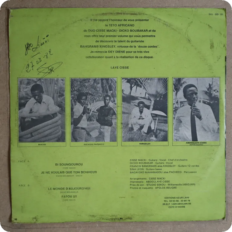 Afro latin LP recorded by the Senegalese guitarist / singer together with Francis Kingsley on 12 strings guitar. Vocals are sung in a swung montuno or Congolese rumba style, w/ acoustic backing adding