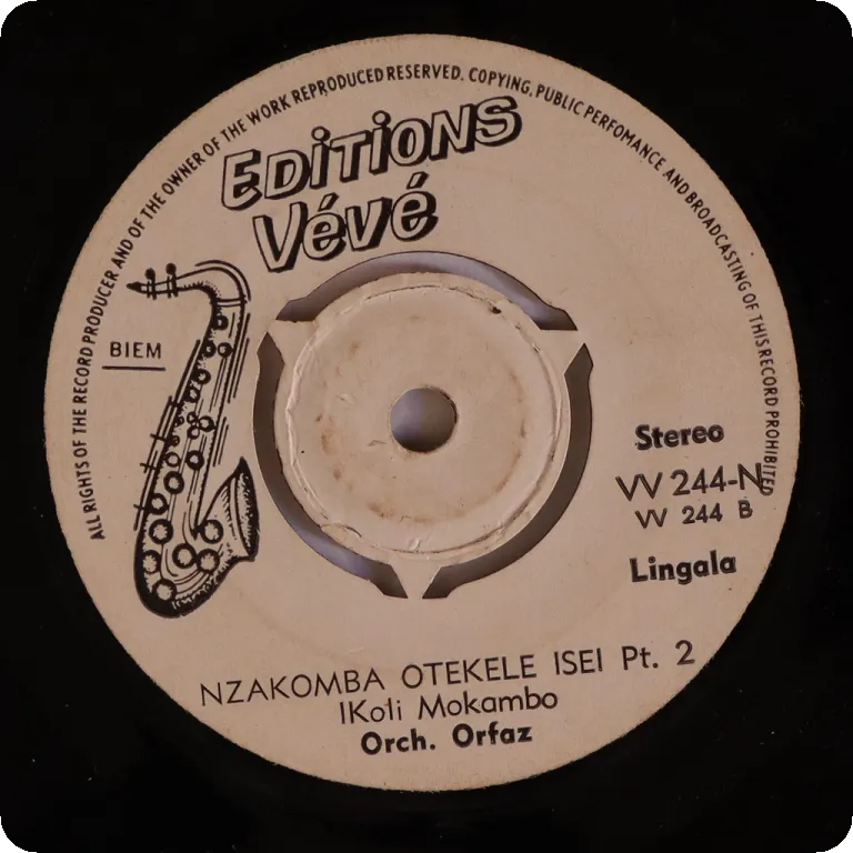 Raw 60's rumba rarity by the Congolese legend with sx & guitar solos on part 2, sleeve has wear, aging, bump & small tear on mouth, shop stamp & pinkish stain on back, light dirt & small writings on