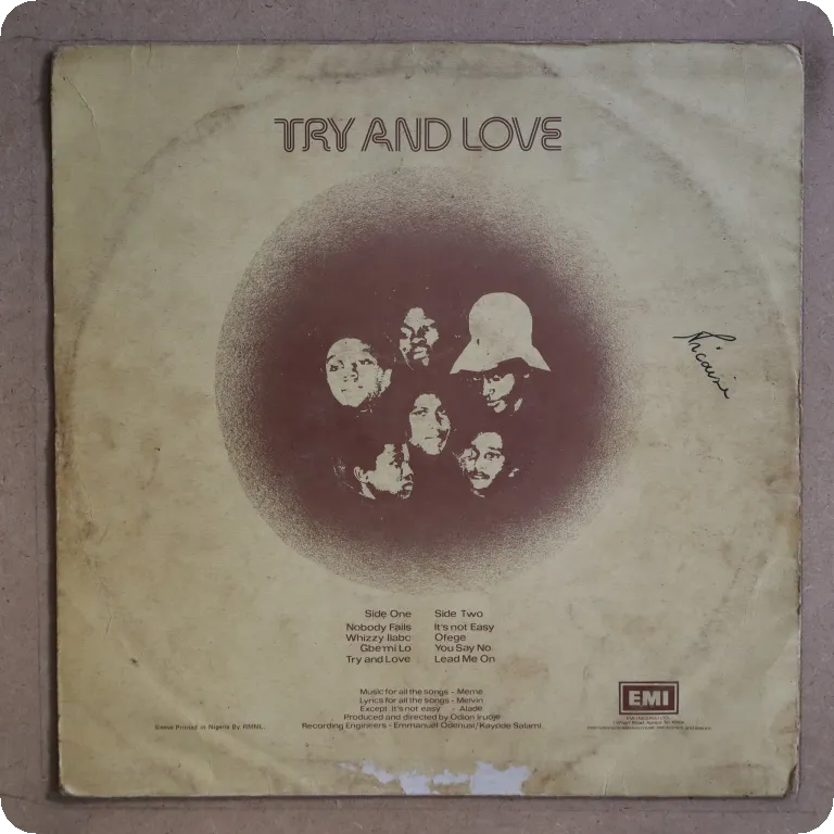 Boogie disco from Africa, self produced. Sleeve has aging & dirt wear, creases, large writings on back, large beige water damage, glue residues along top & bottom visible mainly on back, mini peel off