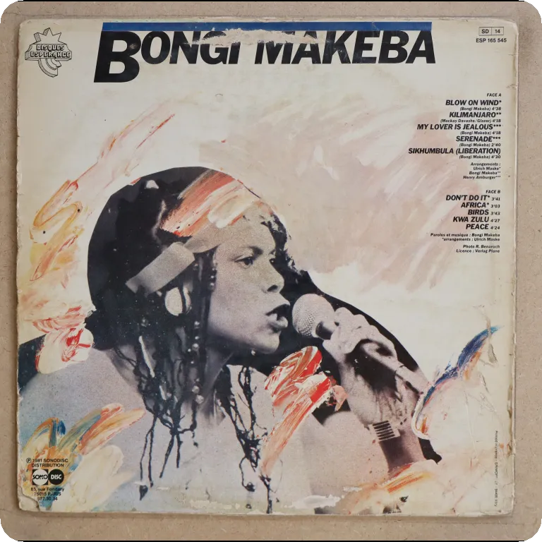 Afrofunk disco & breezy afro jazz fusion tunes as recorded by Myriam Makeba's daughter. Wear & aging on cover, light creases, some peel off & small tears along mouth, shop sticker on front. Record has