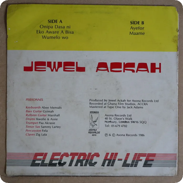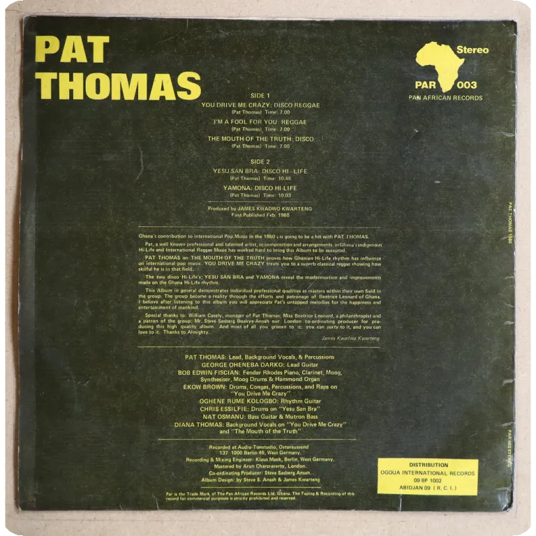 Features the spacey disco funky highlife tune "Yesu san bra" w/ fender rhodes piano solo, the uptempo boogie highlife "yamona" & 2 solid roots reggaes. White label test press. Cover has peeling of the