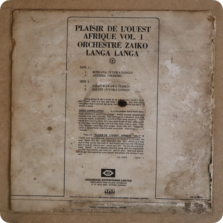 Cover only, no vinyl. Sleeve has wear & dirt, light brown water damage & peel off, 8" split & peel off on spine, black stain & ringwear on back.