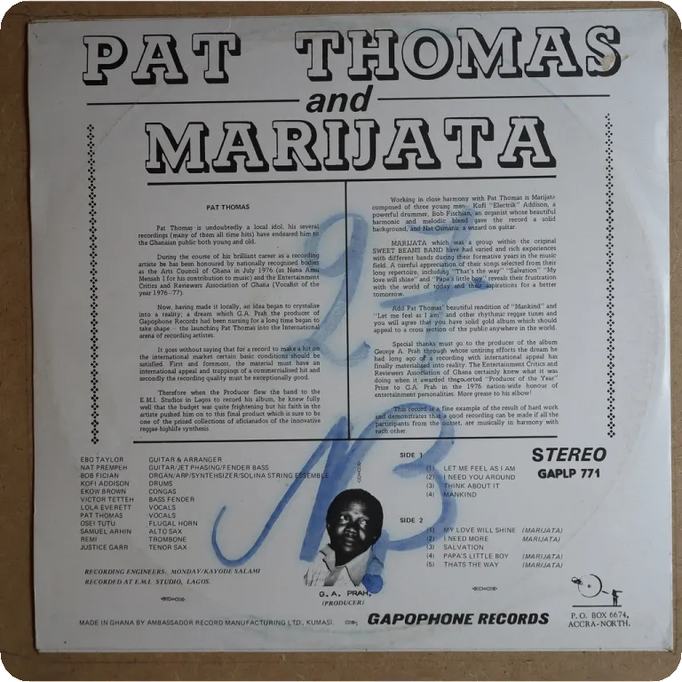 Pat Thomas, Ebo Taylor & the legendary Marijata altogether delivering one of PAT THOMAS' best afro funk tunes "I need more". Sleeve has minor wear, large shop sticker on front, large writings on back