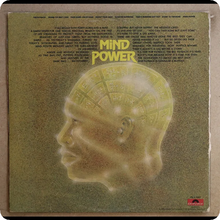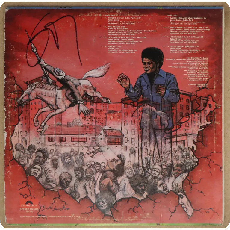 All times funk classic feat. Title tune, King heroin, Talkin loud and sayin nothing, etc. Some wear on cover, thin peel off along mpouth, 3" split on bottom spine, writings on A side label, record has
