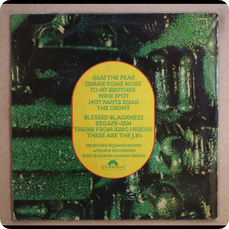 An all times classic by James Brown's orchestra w/ "pass the peas", "gimme some more", "the grunt", "hot pants road", etc. Sleeve has light wear & aging, plays w/ very reasonable to hardly noticeable