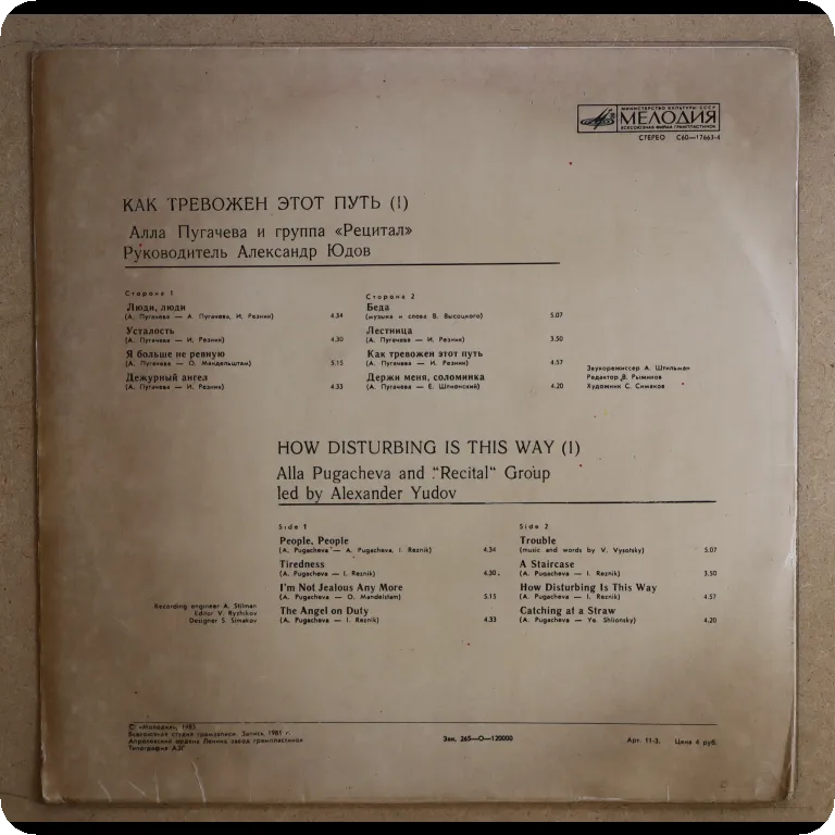 Disco, synth pop & funky dub reggae on this LP by one of Russia's iconic 80' pop stars. Light wear & dirt on cover, writings on labels, record has light to hardly noticeable noise, ranges from very