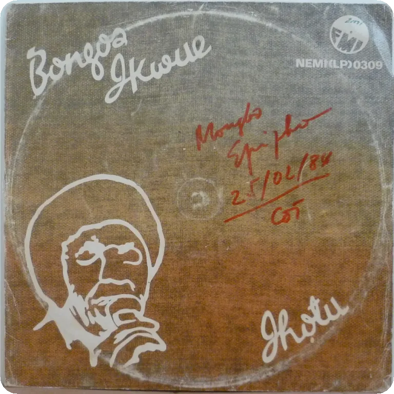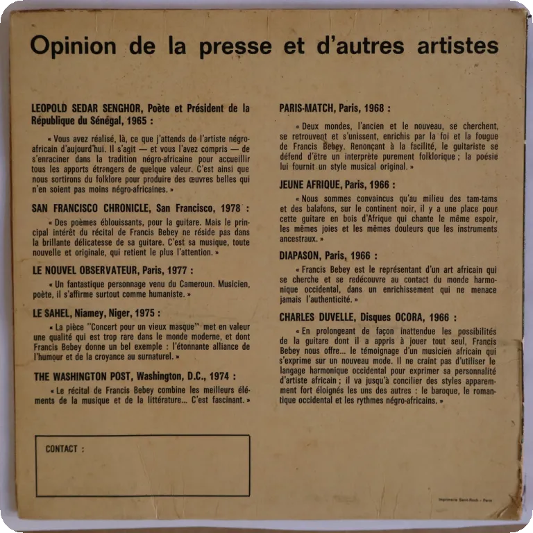 Killer spaced out minimal synth single only winner w/ spoken word as recorded by the south after Cameroon genius. Signed by Francis Bebey on back ! Aging, dirt, light brown water damage wear, peel off, writings on cover & labels, 0,5" split on bottom, ringwear. Plays nicely despite marks.