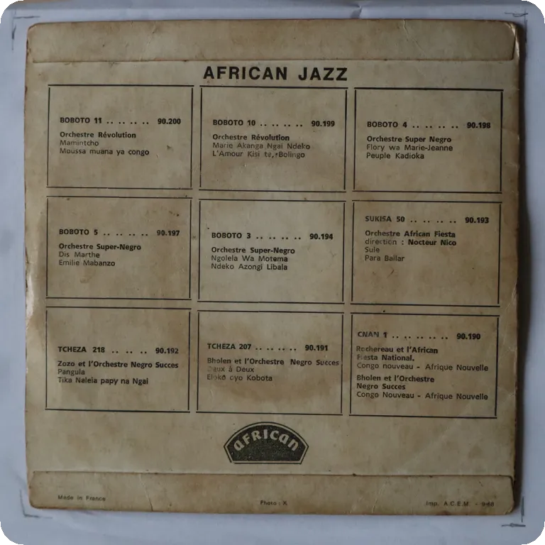 Afro psych / funky jerk w/ solid guitar solo recorded in Congo, sleeve has aging & dirt, 1,5" split on spine, light noise from marks up to no noise on the funk tune, the rumba track plays a bit worse