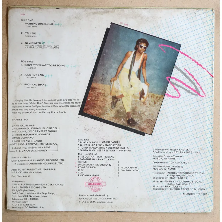 Check the electro funk & the electro oldies rap tunes on this Nigerian release produced by Majek Fashek. Dirt & writings on back, record plays very nicely on stanout tunes, minor occasional noise only despite some marks & visible unremoveable dirt, a bit offcentered w/ sound distortion on A side which contains no highlight tune.