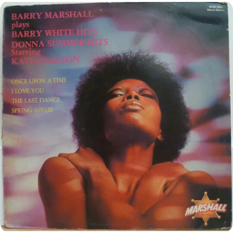 French covers of Donna Summer & Barry White classics. dirt & aging on cover, light brown water damage along miuth, 2,5" split on bottom & spine. Light brown stains on labels, record has light marks &