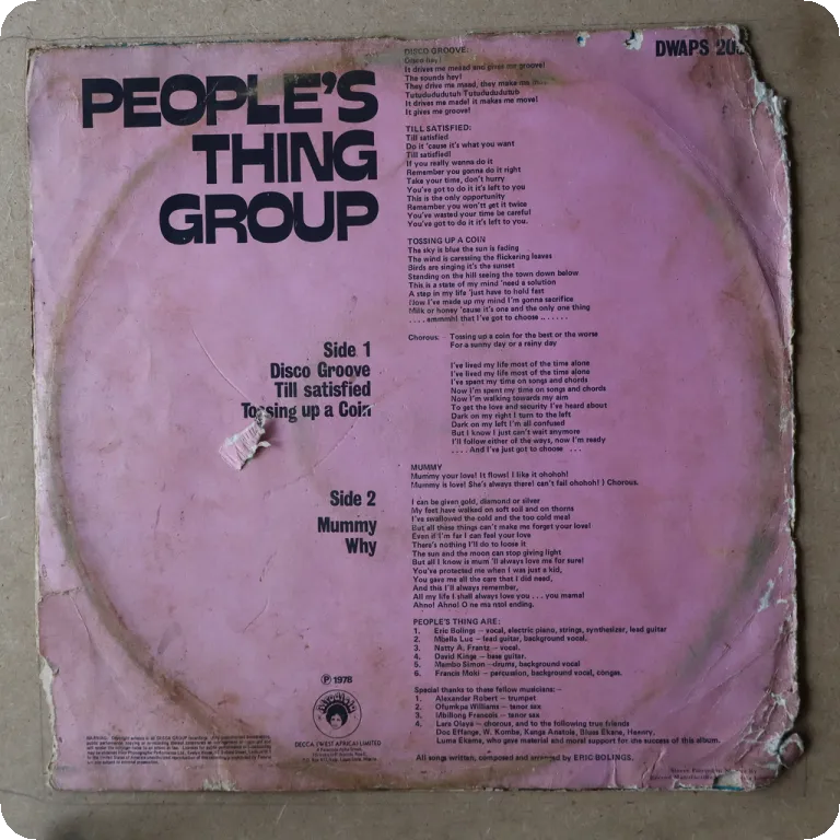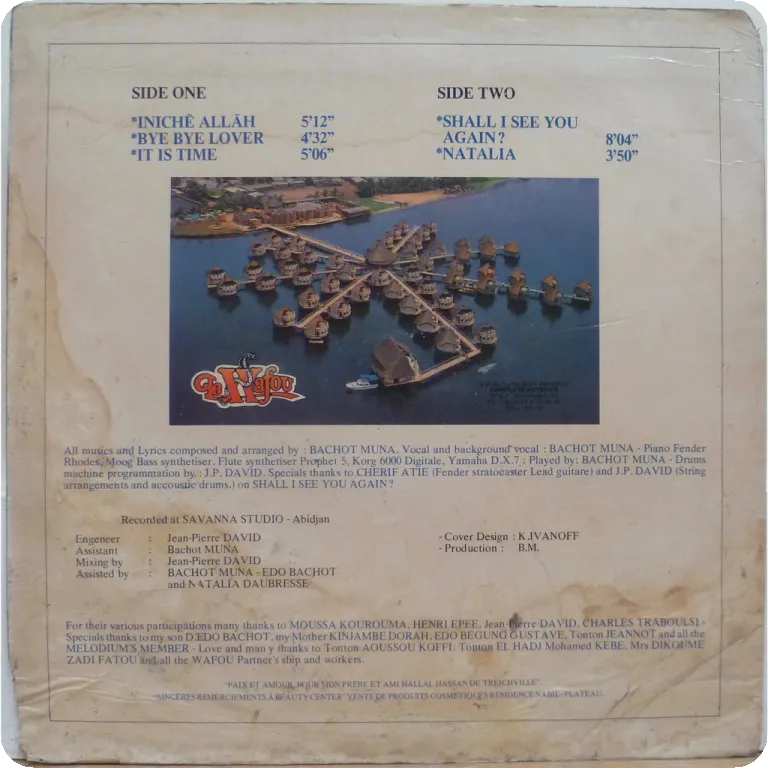 Jaw dropping minimal synth disco / new wave & tropical disco soukous hybrid on this super obscure and indemand 3 tracker French meets African musicians LP. Never shows up !Sleeve w/ large peel off & light brown water damage, bite on top, writings on back & B label, light brown water damage wear on labels, light aging & dirt & peel off along bottom, mini bite on one of the bottom corners, record plays VG to V++, has light clicks from marks on second part of A1 tune and A2 but very enjoyable.