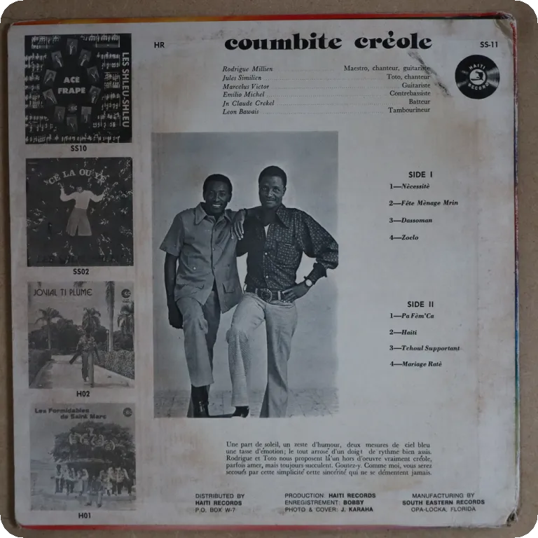 Killer acoustic guitar led tunes by the Haitian vocal duet, very similar to Trio Seleect's early albums but lesser known and underrated. Sleeve has some wear, bumps & some warp on spine corners