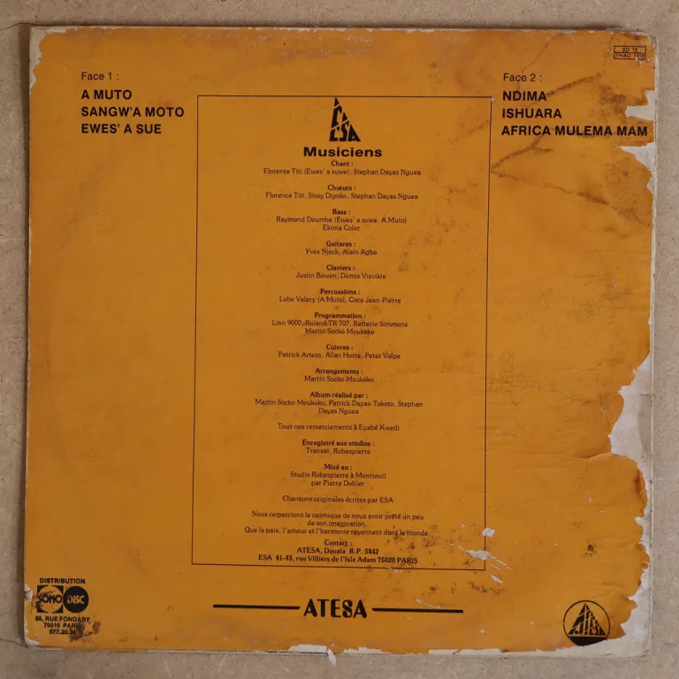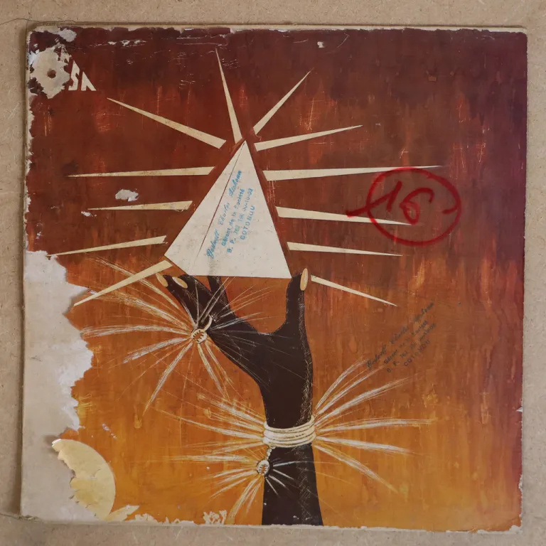 Consistent highlife & asiko music LP, dirt wear & aging on cover, small bites & strong dirt along top & spine & on front close to top spine, rubber stamps on cover, writings on labels, record plays