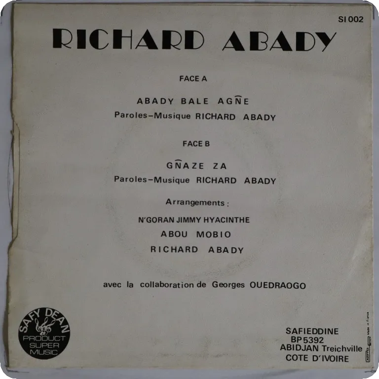 Hypnotic Afro synth / new wave disco & afro synth pop two trackers on this scarce Ivory Coast release w/ backing by the country's creme de la creme : Rato Venance on synth, Kassaby Dehe on percussions, Santa N'guessan on guitars, Wedji Ped on vocal chorus. Sleeve has light aging & dirt, some noise from light marks, plays VG- to solid VG.