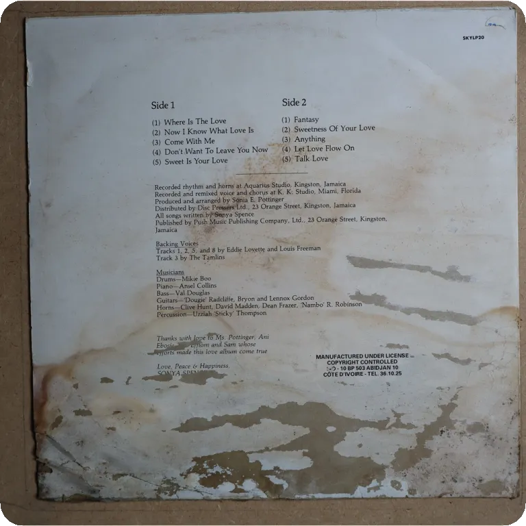 All times classic Southern soul breaks on "I'm your puppet" on this consistent 60's soul ballads & hard soul masterpiece recorded in Muscle Shoals, Alabama. Sleeve has large peel off & light brown water damage along top back, smaller peel off & light brown water damage wear along bottom back, some paper stuck, some light brown water damage wear on front as well. Record plays with minor noise only and has numerous thin marks.