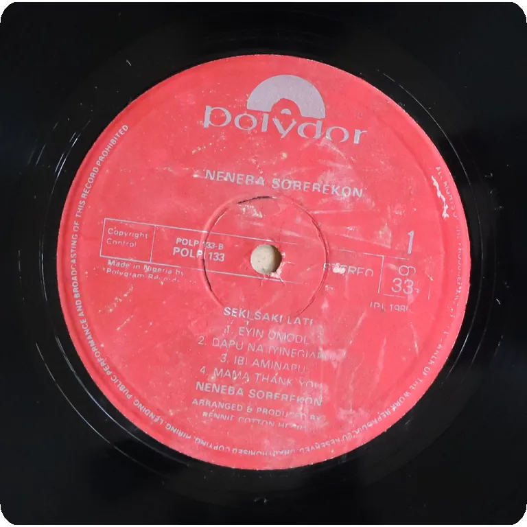 Features the spacey disco funky highlife tune "Yesu san bra" w/ fender rhodes piano solo, the uptempo boogie highlife "yamona" & 2 solid roots reggaes. White label test press. Cover has peeling of the