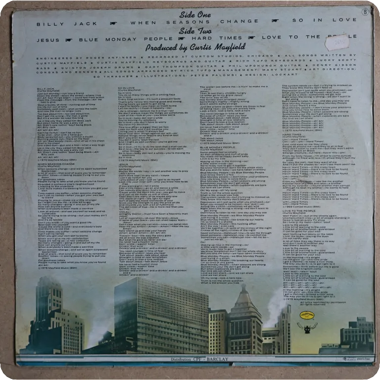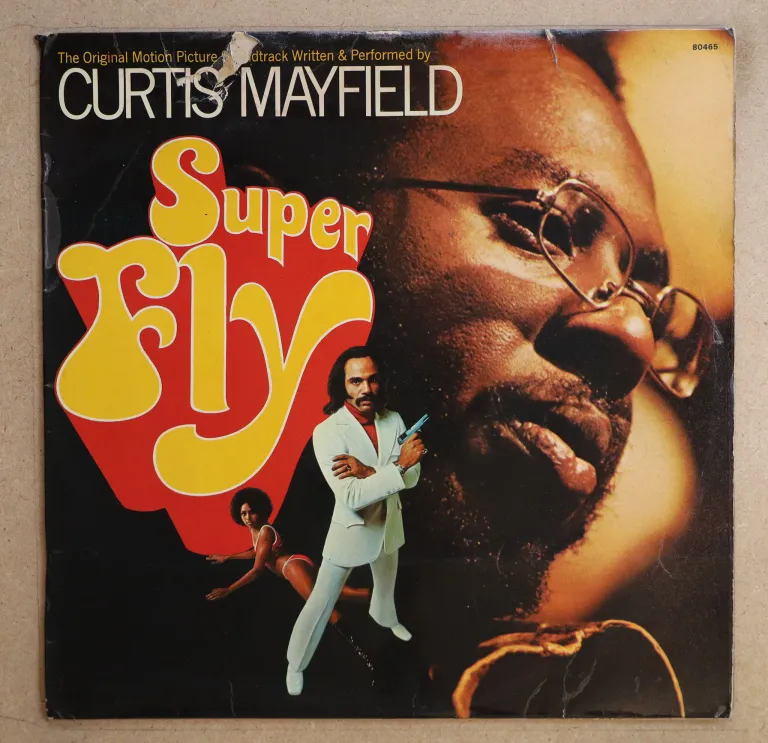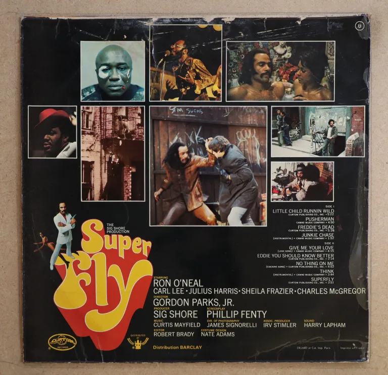 Curtis' all times classic movie soundtrack, features "superfly", "give me your love", "no thing on me", "freddie's dead", etc. Italian pressing. Wear on cover, peel off on front & along top seam on back, air bubbles underneath upper plastic sheet of glossy cover along spine, plays very nicely with occasional light noise & minor marks, VG to EX depending on parts