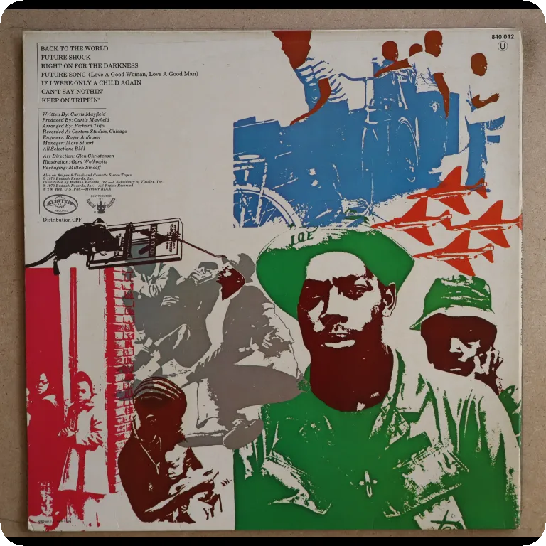 "right on for the darkness" "future shock" & more on this all times classic by the Chicago artist. Minor wear on cover, writing inside gatefold.