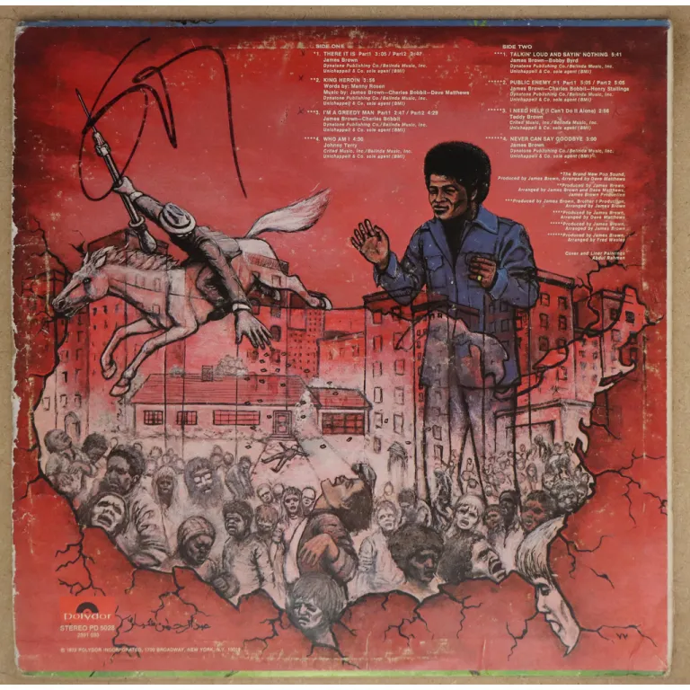 All times funk classic feat. Title tune, King heroin, Talkin loud and sayin nothing, etc. Some wear on cover, thin peel off along mpouth, 3" split on bottom spine, writings on A side label, record has light to hardly noticeable noise only despite numerous surface marks, ranging from weak VG to VG/VG+ depending on part.