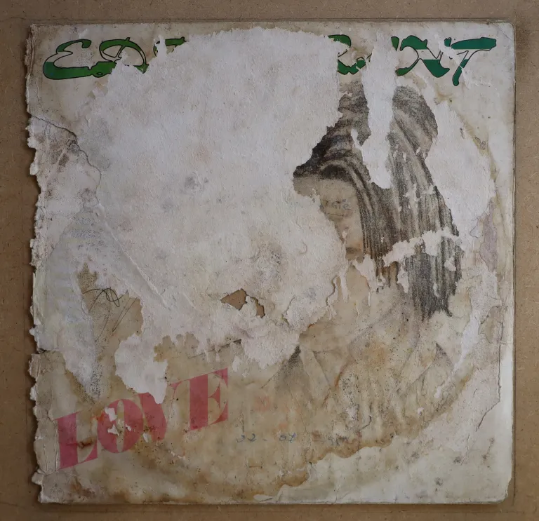 Spacey disco / cosmic electro synth on this 12" only release. Very strong wear on cover, peel off on 60% of front cover, split & narrow bite along all spine, holes on front & back, 7" tear on front, mold wear, light brown water damage on 5/6th of back cover, writings, record plays w/ stron to quite reasonable noise from numerous marks